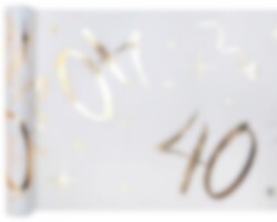 Weißer Tischläufer mit dekorativen Mustern und der Zahl 40 in Goldfolie. Dieser Tischläufer kommt in einer praktischen Rolle und ist 30 cm breit und ganze 5 Meter lang. Das reicht für mehrere Tische und eine große Party. Das Material ist 100% Polyester.