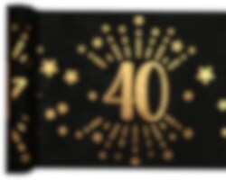 Schwarzer Tischläufer mit dekorativen Mustern und der Zahl 40 in goldener Folie. Der Tischläufer wird als praktische Rolle geliefert, ist 30 cm breit und ganze 5 Meter lang – ideal, um mehrere Tische festlich zu dekorieren. Das Material besteht aus 100 % Polyester.