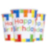 Servieren Sie Saft oder Limonade in diesen farbenfrohen Pappbechern mit Bausteinmotiv. Mit dem Schriftzug "Happy Birthday" und fröhlichen Farben rundum passen sie perfekt zu einem Kindergeburtstag mit Baustein-Motto. Die Becher fassen 266 ml und sind etwa 10 cm hoch.