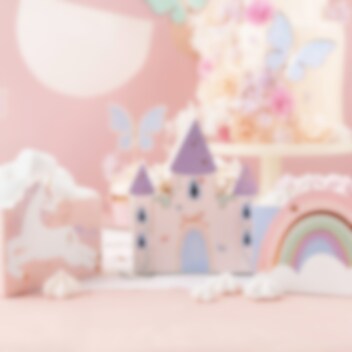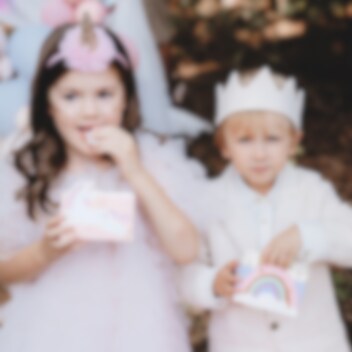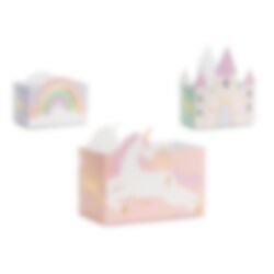 6 Snackboxen in Pastellfarben mit wunderschönen Motiven von Einhörnern, Schlössern und Regenbögen. Perfekt, um Snacks oder Süßigkeiten für einen Kindergeburtstag mit Einhornmotto zu servieren.