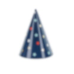 6 Partyhüte mit bunten Sternen auf einem blauen Hintergrund. Die Hüte sind 16 cm hoch und werden mit Gummibändern befestigt.