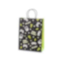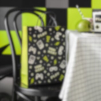 Geschenktüte, die mit ihrem coolen Gaming-Thema-Design auffällt. Die Tüte hat zwei Griffe, ist aus Papier gefertigt und ist 10 x 32 x 24 cm groß.