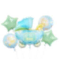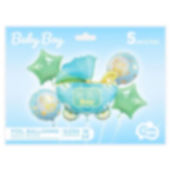 Köstlicher Ballon Bouquet mit verschiedenen Folienballons blauen Babyparty-Motto. Das Bouquet besteht aus einem großen Ballon in Kinderwagenform mit dem Text Baby Boy, 55 cm, zwei runden Ballons mit dem Text It's a boy, 35 cm und zwei herzförmigen mintgrünen Ballons, 35 cm. Zusätzlich zu den Ballons ist eine weiße Ballonschnur enthalten.