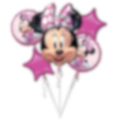 Rosa Ballon Bouquet mit einem Motiv von Minnie Maus. Dekorieren Sie damit den Raum für die Kinderparty mit einem Disney- oder Minnie Maus-Motto. Das Paket enthält
