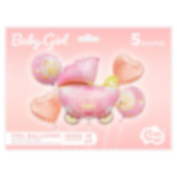 Wunderschön Ballon Bouquet mit verschiedenen Folienballons im rosa Babyparty-Motto. Das Bouquet besteht aus einem großen Ballon in Kinderwagenform mit dem Text Baby Girl, 55 cm, zwei runden Ballons mit dem Text It's a Girl, 35 cm und zwei herzförmigen Ballons in Roségold, 35 cm. Zusätzlich zu den Ballons ist eine weiße Ballonschnur enthalten.