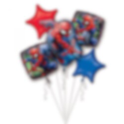 Cooles Bouquet mit Folienballons im Spiderman-Motto. Am besten zum Aufblasen mit Helium geeignet, funktioniert aber auch mit normaler Luft, allerdings müssen die Ballons dann aufgehangen werden. Enthält einen großen geformten Ballon, ca. 70 cm hoch, 2 quadratische Luftballons mit Motiven, ca. 45 x 45 cm groß und 2 sternförmige Luftballons in roter und blauer Farbe.
