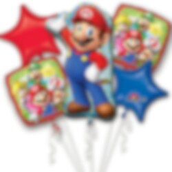 Cooles Ballon Bouquet im Super Mario-Motto. Dekorieren Sie damit den Partyraum. Die Packung enthält 5 Stück Luftballons. 1 Supershaped Ballon wie Mario (55 x 83 cm), 2 sternförmige Ballons (48 cm) und 2 quadratische Luftballons (43 cm). Kann mit Luft oder Helium gefüllt werden.