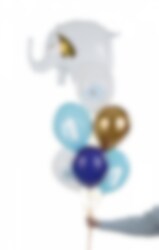 Die Packung enthält 2 hellblaue Luftballons mit weißem Motiv, 2 weiße Luftballons mit hellblauen Elefanten, 1 goldener Folienballon und 1 dunkelblauer Ballon.