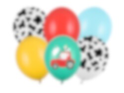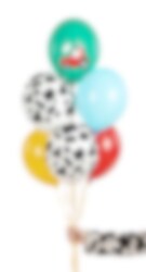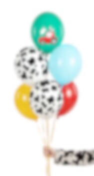 Die Packung enthält 2 weiße Luftballons mit schwarzen Kuhflecken, 1 gelber Ballon, 1 roter Ballon, 1 hellblauer Ballon und 1 türkisfarbener Luftballon mit einem roten Traktor.