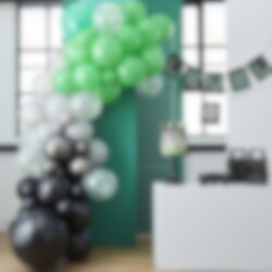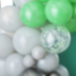 Schöne Ballongirlande in Schwarz-, Grün- und Grautönen zum selber aufbauen. Eine wirklich coole Dekoration, die sowohl für Kinderpartys als auch anderen Feierlichkeiten geeignet ist. Die Packung enthält insgesamt 70 Luftballons in verschiedenen Größen und Zubehör. Die Ballongirlande ist etwa 5 Meter lang.