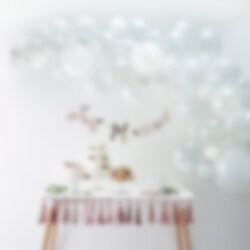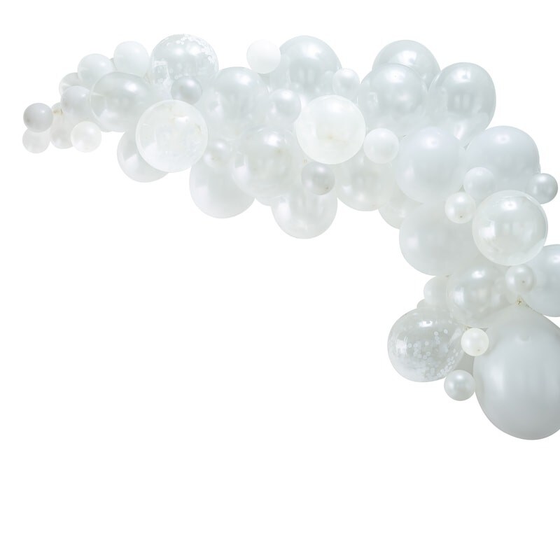 Ausgefallene Ballongirlande in Weißtönen zum selber aufbauen. Eine tolle Dekoration, die für Partys oder auch Hochzeiten geeignet ist. Die Packung enthält insgesamt 70 Luftballons in verschiedenen Größen und Zubehör. Die Ballongirlande ist etwa 4 Meter lang.