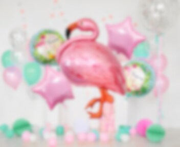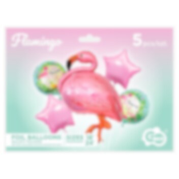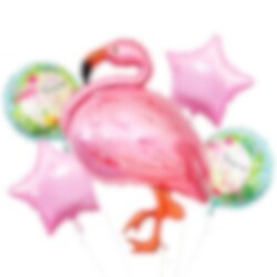 Wunderschöner Ballon Bouquet mit verschiedenen Folienballons Flamingo-Motiv. Das Bouquet besteht aus einem großen Flamingo-Ballon, 55 cm, zwei runden Ballons mit Motiven von Flamingos, 35 cm und zwei sternförmigen rosa Ballons, 35 cm. Zusätzlich zu den Ballons ist eine weiße Ballonschnur enthalten.