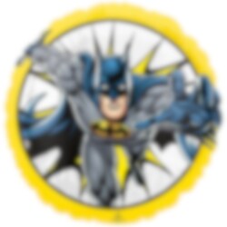 Runder Folienballon mit gelben Rändern und Batman auf der Vorderseite. Eine coole Dekoration für die Batman- oder Superhelden-Mottoparty. Der Ballon hat aufgeblasen einen Durchmesser von etwa 43 cm und wird mit Luft oder Helium gefüllt.