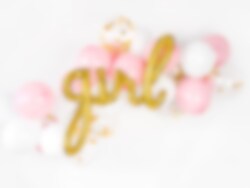 Goldfolienballon, der das Wort "Girl“ bildet. Ein dekorativer Artikel für die Babyparty. Der Ballon ist aufgeblasen etwa 77 x 70 cm groß und lässt sich am einfachsten mit normaler Luft aufblasen.