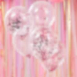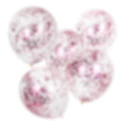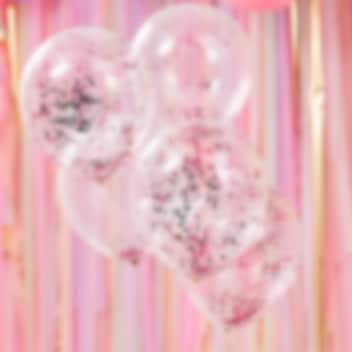 5 transparente Luftballons gefüllt mit glitzerndem, rosa Konfetti. Die Ballons haben im aufgeblasenen Zustand einen Durchmesser von etwa 30 cm und können mit normaler Luft oder Helium gefüllt werden.