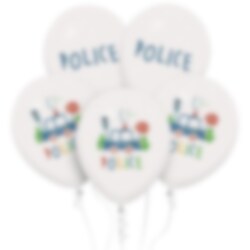 6 weiße Latexballons mit Polizeiauto-Motiven und dem Text "Police".