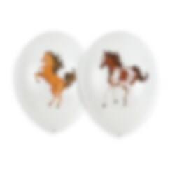 6 weiße Latexballons mit Motiven von schönen Pferde. Eine tolle Dekoration für die Pferde-Mottoparty. Die Ballons haben im aufgeblasenen Zustand einen Durchmesser von 27,5 cm und werden mit Luft oder Helium aufgeblasen. Wenn Sie sie mit Luft aufblasen möchtest, empfehlen wir die Verwendung einer Ballonpumpe.