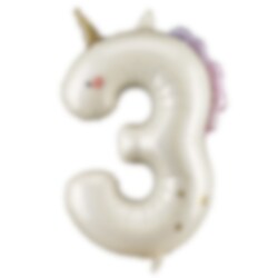 Ein dekorativer Folienballon in Form der Zahl 3 mit wunderschönem Einhorn-Design. Perfekt für Geburtstagsfeierlichkeiten oder als Teil einer Zahlenkombination.