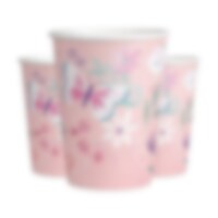 8 Pappbecher in Hellrosa mit weißen Rändern und wunderschönen Schmetterlingen zwischen Blumen. Nutzen Sie diese so, dass der Tisch bei einer Party besonders schön gedeckt wird. Die Becher sind 10 cm hoch und fassen etwa 250 ml.