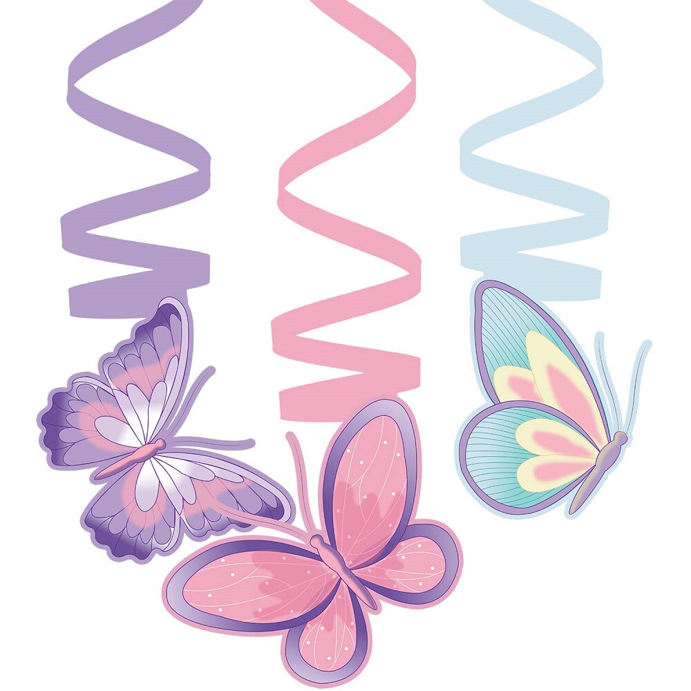 Hängende Dekorationen mit bunten Schmetterlingen und Blumen auf beiden Seiten. Dekorieren Sie den Raum damit, um ihn für die Kinderparty zu verschönern. Die Packung enthält 6 Spiraldekorationen, die etwa 14 cm lang sind und deren Motive etwa 10 cm groß sind.