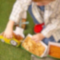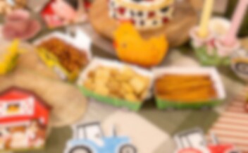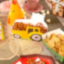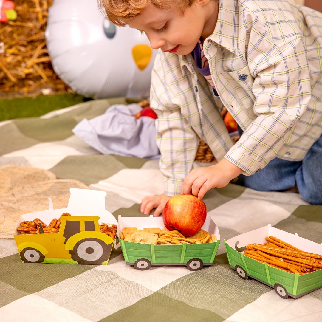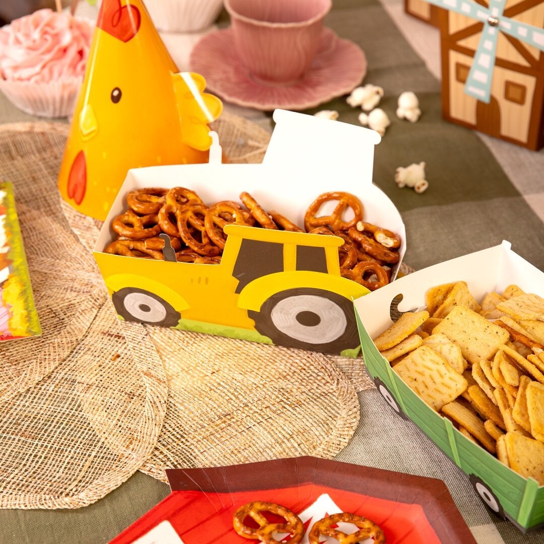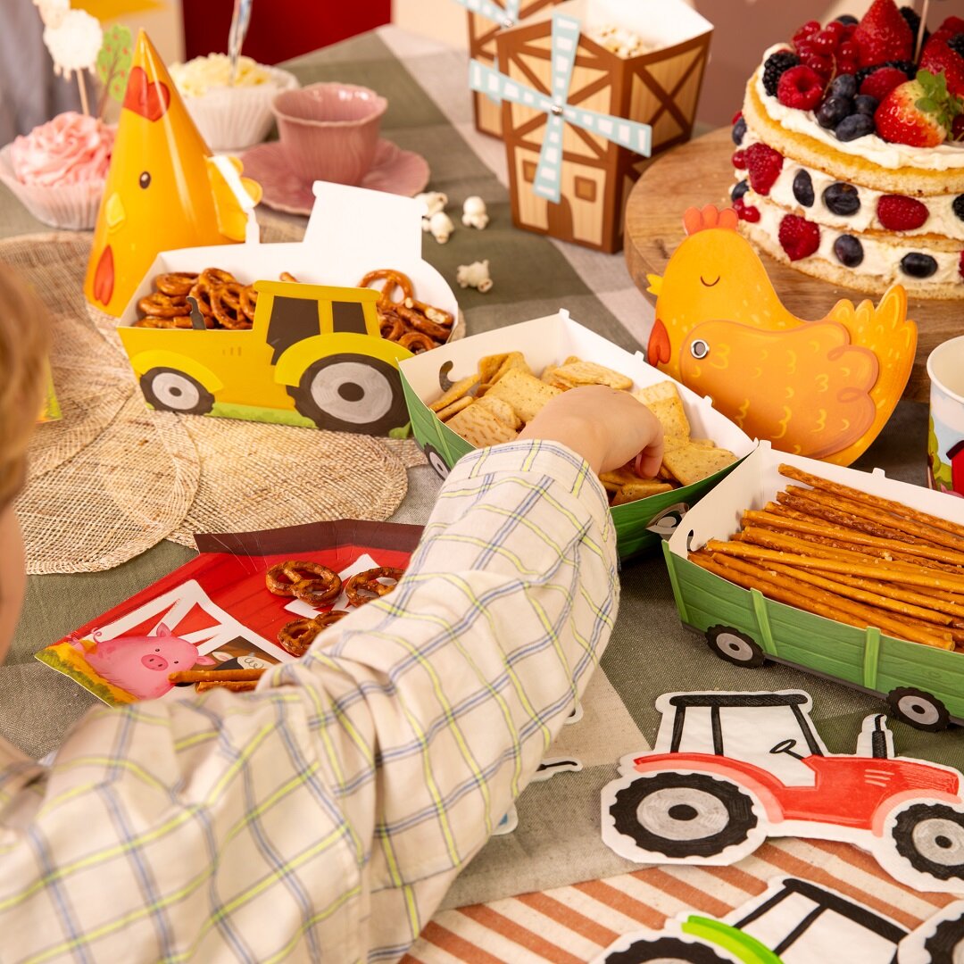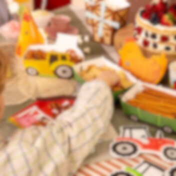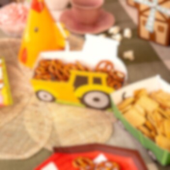 3 Snackboxen: eine in Form eines Traktors und zwei in Form passender Anhänger, die zu einem verspielten und auffälligen Detail auf dem Geburtstagstisch werden. Sie passen perfekt zu einem Kindergeburtstag mit Bauernhof-Thema und machen das Servieren für kleine Gäste besonders lustig. Füllen Sie die Boxen mit Chips, Popcorn, Süßigkeiten oder anderen Snacks und lassen Sie sie zu einem dekorativen Teil der Tischdekoration werden. Die Boxen sind aus Papier gefertigt. Der Traktor misst 16 x 10 x 4,5 cm.