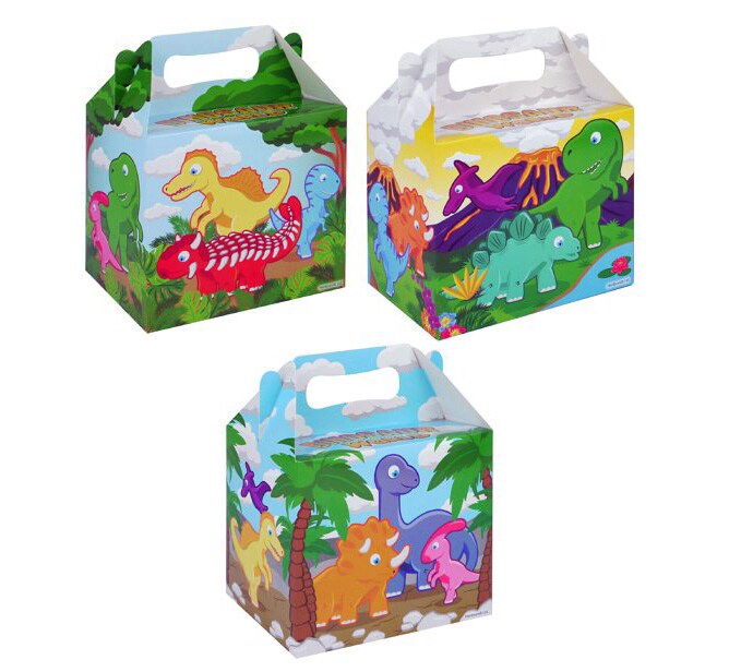 Bunte Geschenkbox mit drei verschiedenen Designs im Dinosaurier-Motto. Perfekt, um darin Süßigkeiten und Spielzeug für die Kinderparty zu verstauen. Die Geschenkbox besteht aus Pappe und lässt sich leicht zusammenfalten.