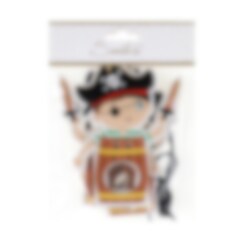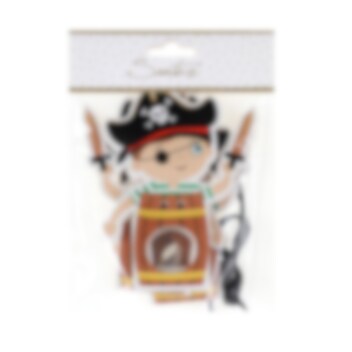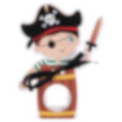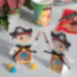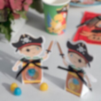 6 kleine Boxen, die einen coolen Piraten darstellen, der in einem braunen Fass sitzt. Füllen Sie diese mit etwas Gutem und stellen Sie sie als lustige Überraschung für die Gäste auf der Piratenparty auf den Tisch.