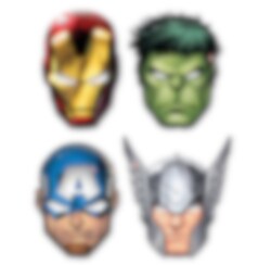 6 Masken, die Hulk Thor, Captain America und Iron Man darstellen. Verwenden Sie diese, damit sich die Partygäste als Ihre Lieblingshelden verkleiden können. Die Masken bestehen aus Papier und werden mit einem Gummiband befestigt.