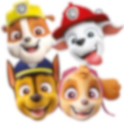 8 Masken aus Papier geformt wie Marshall, Chase, Rubble und Skye von Paw Patrol. Die Masken sind etwa 20 x 19 cm groß und werden mit Hilfe eines Gummibandes an Ort und Stelle gehalten.