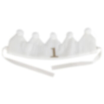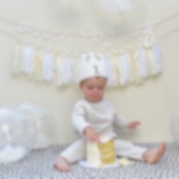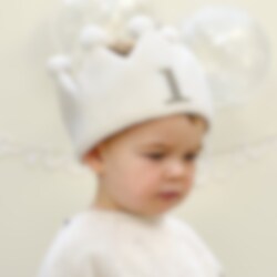 Feiern Sie den 1. Geburtstag mit Stil mit dieser süßen Stoffkrone! Die cremefarbene Krone hat Pompon-Dekorationen und Bindebänder aus Ripsband. Perfekt, um eine unvergessliche erste Geburtstagsfeier zu kreieren.