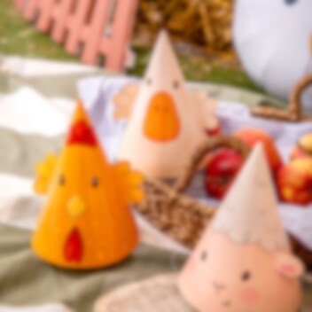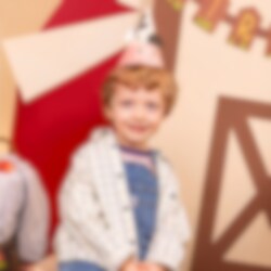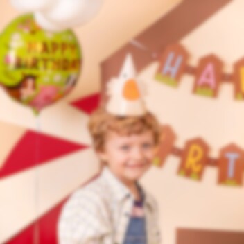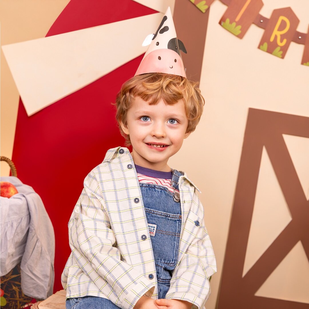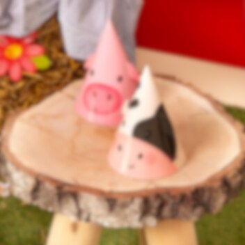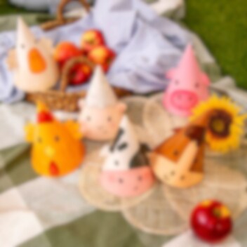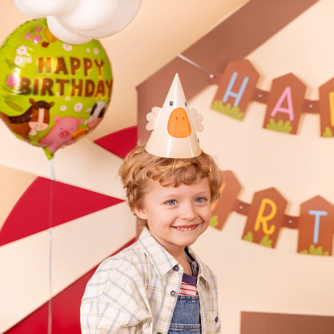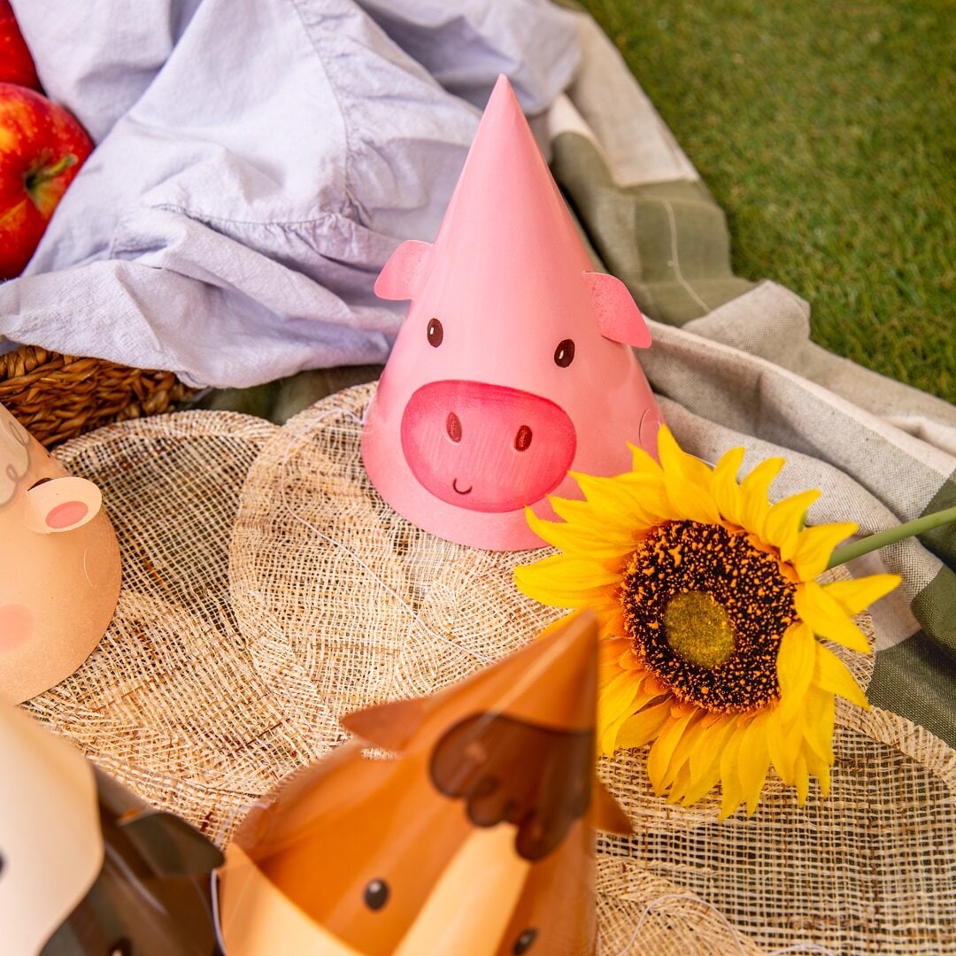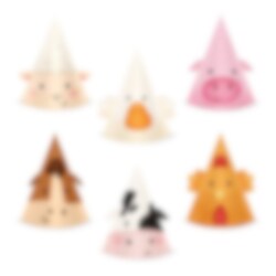 6 Partyhüte im Bauernhof-Design, die eine verspielte und charmante Dekoration für den Kindergeburtstag sind. Die Hüte haben niedliche Motive wie Schaf, Ente, Schwein, Pferd, Kuh und Huhn, was perfekt zu einer Bauernhof-Mottoparty passt.