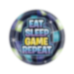 8 Kuchenteller mit schönen dunklen Farben und dem Text "Eat, Sleep, Game, Repeat“, der sich auf das Videospiel Fortnite bezieht. Die Kuchenteller haben einen Durchmesser von etwa 18 cm.