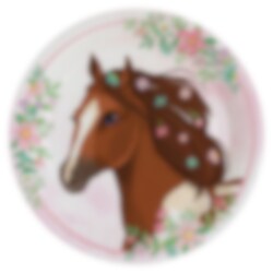 8 Teller aus Papier in Rosatönen mit Motiven eines wunderschönen braunen Pferdes und bunten Blumen. Ein schönes Accessoire für die Kinderparty.