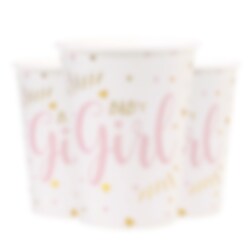 10 Pappbecher in Weiß mit dem Text "Baby Girl“ und mit Motiven aus feinen Details in den Farben Rosa und Goldfolie. Ein schönes Zubehör, das man bei der Babyparty oder Taufe verwenden kann. Lässt sich gut mit unseren anderen Accessoires zum gleichen Thema kombinieren.
