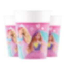 8 Pappbecher mit einem schönen Barbie-Motiv und farbenfrohen, schönen Details. Stilvolle Becher für den gedeckten Tisch, wenn es Zeit für eine Party ist.