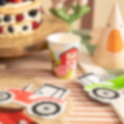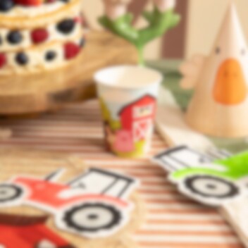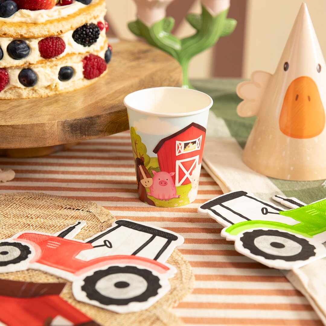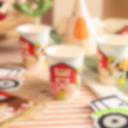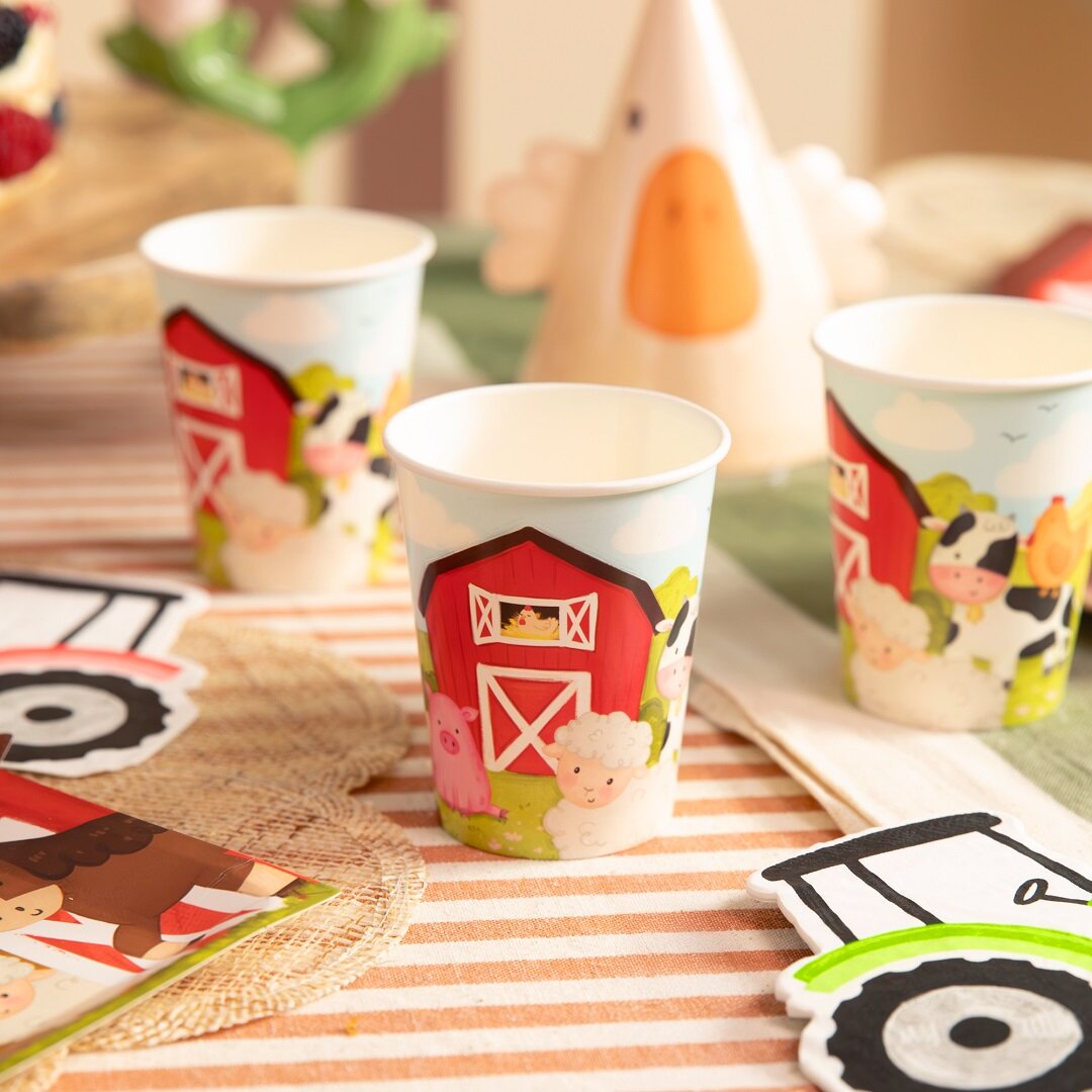 6 Pappbecher im Bauernhof-Design, die die Tischdekoration für den Kindergeburtstag besonders verspielt machen. Die Becher sind mit niedlichen Bauernhoftieren, einer roten Scheune und einem ländlichen Motiv verziert, das perfekt zu einer Bauernhof-Geburtstagsparty passt.