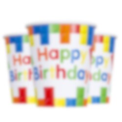 Servieren Sie Saft oder Limonade in diesen farbenfrohen Pappbechern mit Bausteinmotiv. Mit dem Schriftzug "Happy Birthday" und fröhlichen Farben rundum passen sie perfekt zu einem Kindergeburtstag mit Baustein-Motto. Die Becher fassen 266 ml und sind etwa 10 cm hoch.