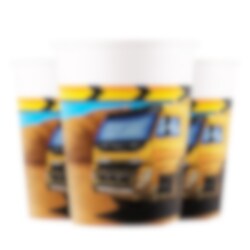 8 Pappbecher mit bunten Motiven von Baufahrzeugen. Die Becher sind 10 cm hoch und fassen etwa 200 ml.
