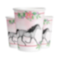 8 Pappbecher in Rosa und Weiß mit Motiven von sehr schönen Pferden und Blumen. Ein wunderschönes Accessoire für die Pferde Kinderparty. Die Becher sind 10 cm hoch und fassen etwa 250 ml.