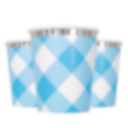 8 Pappbecher mit blau-weißem Karomuster und Silberfolien-Rändern. Ein schönes Partygeschirr für jede Feier. Die Becher sind etwa 10 cm hoch und fassen etwa 270 ml.