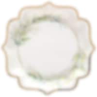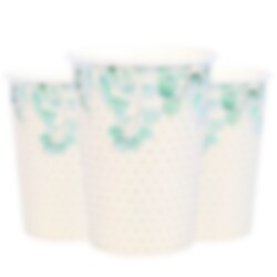 10 Pappbecher mit dekorativen Goldpunkten und einem Blattmuster in Grüntönen. Die Becher sind etwa 10 cm hoch und fassen 270 ml.