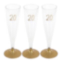 6 schöne und praktische Einweggläser im Champagner-Stil. Mit den Gläsern können Sie auf der 20. Geburtstagsfeier sowohl den Tisch decken als auch sich unter die Gäste mischen. Die Gläser fassen 14 cl. und stehen auf einem goldenen Fuß und haben die Zahl "20" oben aufgedruckt.