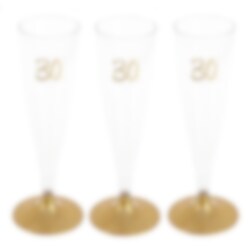 6 schöne und praktische Einweggläser im Champagner-Stil. Mit den Gläsern können Sie auf der 30. Geburtstagsfeier sowohl den Tisch decken als auch sich unter die Gäste mischen. Die Gläser fassen 14 cl. und stehen auf einem goldenen Fuß und haben die Zahl "30" oben aufgedruckt.