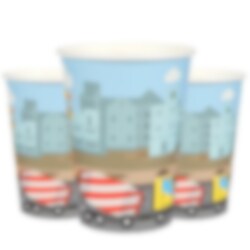 10 Pappbecher mit Motiven von Arbeitsfahrzeugen. Die Becher sind 10 cm hoch und fassen 270 ml.