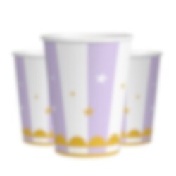 8 Pappbecher in schöner lila Pastellfarbe mit Sternen und Dekorationen in glänzender Goldfolie. Perfekt für alle festlichen Anlässe. Die Becher sind etwa 10 cm hoch und fassen 266 ml. Sie sind eine stilvolle Ergänzung zu jeder Tischdekoration.
