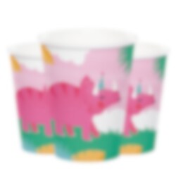 8 Pappbecher mit schönen Motiven von Dinosauriern. Die Becher sind 10 cm hoch und fassen etwa 266 ml.