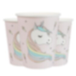10 supersüße Pappbecher in Rosa mit dem Motiv eines Einhorns. Die Becher sind etwa 9,7 cm hoch und fassen 270 ml.