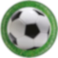 8 Pappbecher mit Fußbällen. Die Becher sind 10 cm hoch und fassen etwa 200 ml.