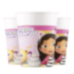 8 Pappbecher mit einem süßen Motiv von Gabby's Dollhouse. Die Becher sind 10 cm hoch und fassen etwa 200 ml.