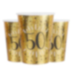 10 glänzende Pappbecher in Gold mit der Zahl 50. Diese eleganten Becher sind perfekt, um Getränke stilvoll zu servieren und verleihen der 50. Geburtstagsfeier einen festlichen Glanz. Sie sind ca. 10 cm hoch und fassen 270 ml.